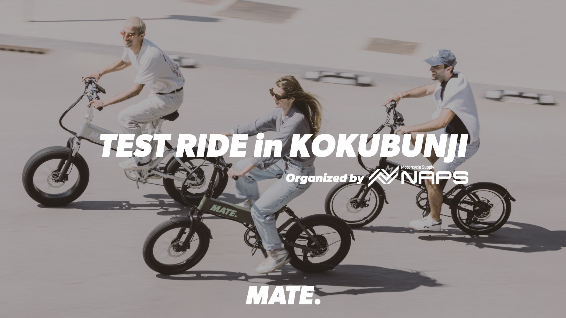 先月からMATE.BIKEの取扱を開始したオートバイ用品店"NAPS"が国分寺で開催する"駅前広場EVモビリティ試乗会"にMATE.BIKEが参加します。